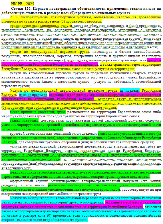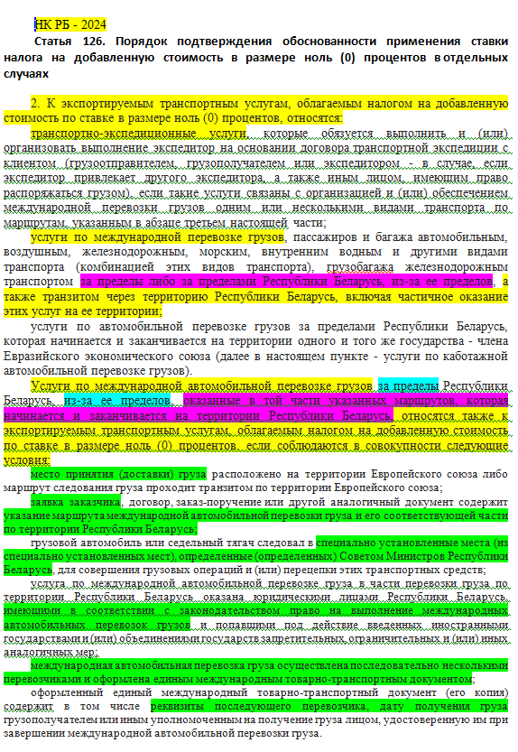 не могу успокоится...сравнила редакции 2024 и 2025 года. Изменился, вернее добавился последний абзац, где сказано, ЧТО - когда транзитная перевозка, допустим из ПОЛЬШИ (мы перегружаем В свою машину на ТЛЦ) в РОСИЮ, но МЫ везем только по территории РБ, то есть перегружаем ИЗ своей машины в другую НЕ довезя до РФ - то ВСЁ РАВНО 0% с 2025 года. А РАНЬШЕ надо было в таком случае под 20%...так? ТО ЕСТЬ наоборот, законодательство и ЭТО РАЗРЕШИЛО под 0%. А сегодня нам сказали абсолютно обратное